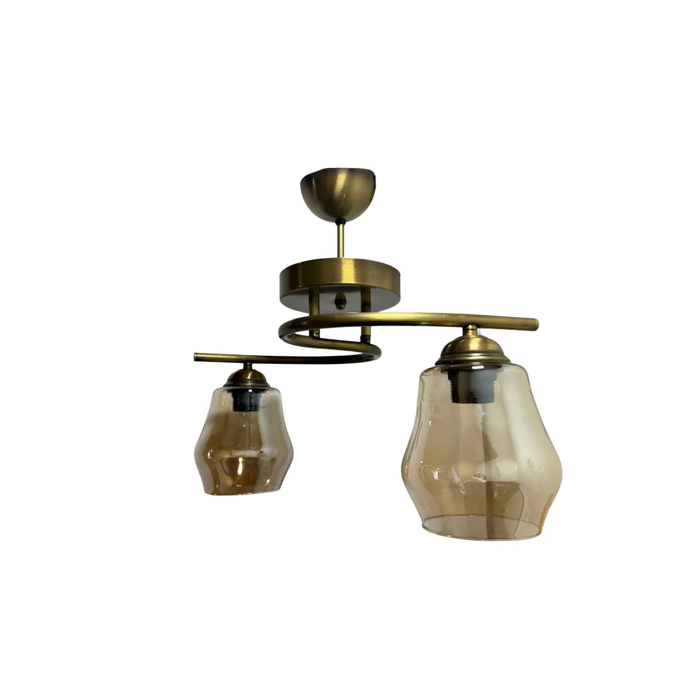 Προσθέστε μια πινελιά διαχρονικής κομψότητας στον χώρο σας με αυτό το ιδιαίτερο δίφωτο φωτιστικό οροφής. Ο σκελετός του, με καμπυλωτό σχεδιασμό σε αντικέ μπρούτζινο χρώμα, συνδυάζεται άψογα με τις μελί γυάλινες καμπάνες, δημιουργώντας μια ζεστή και φιλόξενη ατμόσφαιρα. Ιδανικό για σαλόνια, τραπεζαρίες ή ακόμα και υπνοδωμάτια που αναζητούν έναν συνδυασμό κλασικού και industrial στυλ.