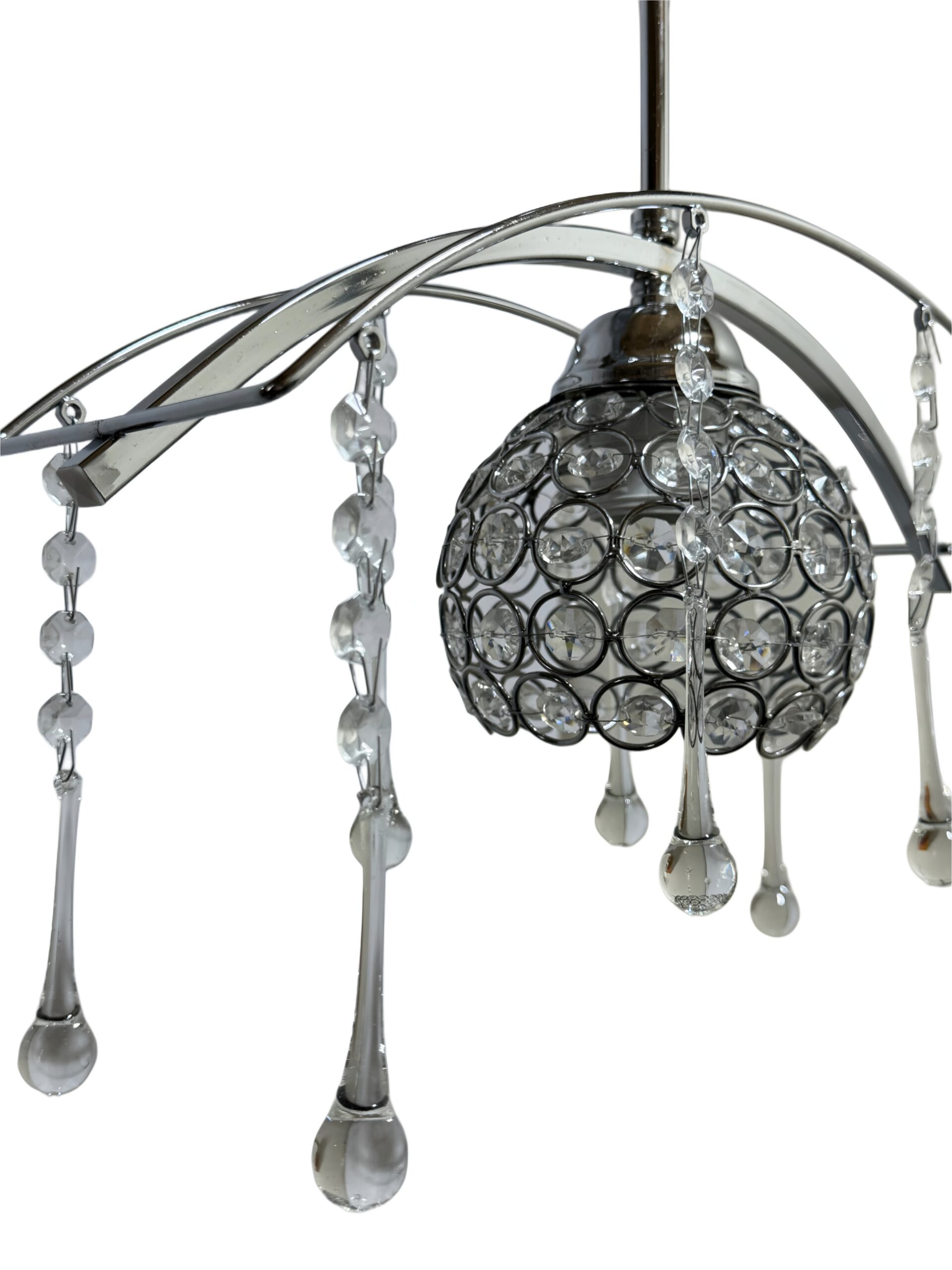 Δώστε μια αίσθηση διακριτικής πολυτέλειας στον χώρο σας με αυτό το ιδιαίτερο κρεμαστό φωτιστικό. Ο συνδυασμός της κεντρικής κρυστάλλινης σφαίρας και των κρεμαστών στοιχείων σε σχήμα δακρύου δημιουργεί μοναδικές αντανακλάσεις φωτός. Η τοξωτή βάση σε χρώμιο προσδίδει μια σύγχρονη γεωμετρία που ταιριάζει άψογα σε σαλόνια, κρεβατοκάμαρες ή ακόμα και σε εισόδους σπιτιών